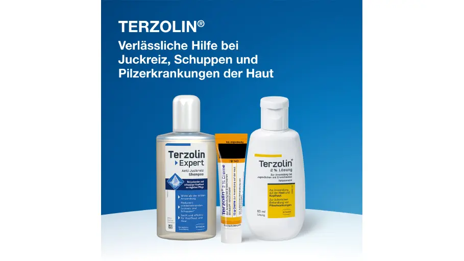 Hefe-artige Pilze wie Malassezia furfur sind ein typischer Auslöser von Schuppen. Terzolin® wird vor allem bei der Therapie von Kleienpilzflechte und seborrhoischer Dermatitis eingesetzt. Der enthaltene Wirkstoff Ketoconazol hemmt das Pilzwachstum und verhindert so die Bildung neuer Schuppen. Außerdem ist Terzolin® 2 % Creme entzündungshemmend und lindert Juckreiz. Dadurch, dass der Wirkstoff nicht wasserlöslich ist, verbleibt er auch nach dem Waschen auf der Haut und kann so bis zu zwei Wochen seine Restwirkung entfalten.